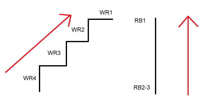 Don’t waste your money (FAAB) or priority on non-difference makers. But who qualifies as a difference maker? If you can’t envision starting the player in question, don’t bother picking them up. Depth is nice, but save your money for a player that can move the needle for your team. Most of the league-winning waiver moves per season will occur at the RB position. The reason is simple. On most teams, one running back gets the large majority of touches (carries + targets). If that running back gets hurt, the next man up stands to inherit a big opportunity to pile up fantasy points. It doesn’t work the same way for wide receivers. The main reason is that wide receiver targets are spread out more. The WR1 on a team might max out at a 25% target share. Additionally, if the WR1 goes down, each WR will typically just slide up one spot (from WR2 to WR1, WR3 to WR2, etc.). It’s very rare for a waiver wire wide receiver to fall into a huge fantasy opportunity. Said another way, running backs take an elevator to increased fantasy relevance, while wide receivers have to take the stairs. See below. To maximize your chances of hitting the waiver wire jackpot, save your FAAB/priority for running backs and avoid most wide receivers.